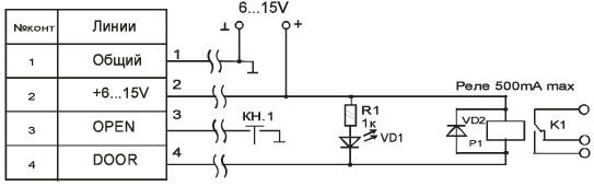 Установленный замок в дверь, раму или другое устройство, управляется через разъем внешнего подключения. Пример подключения указан на схеме: